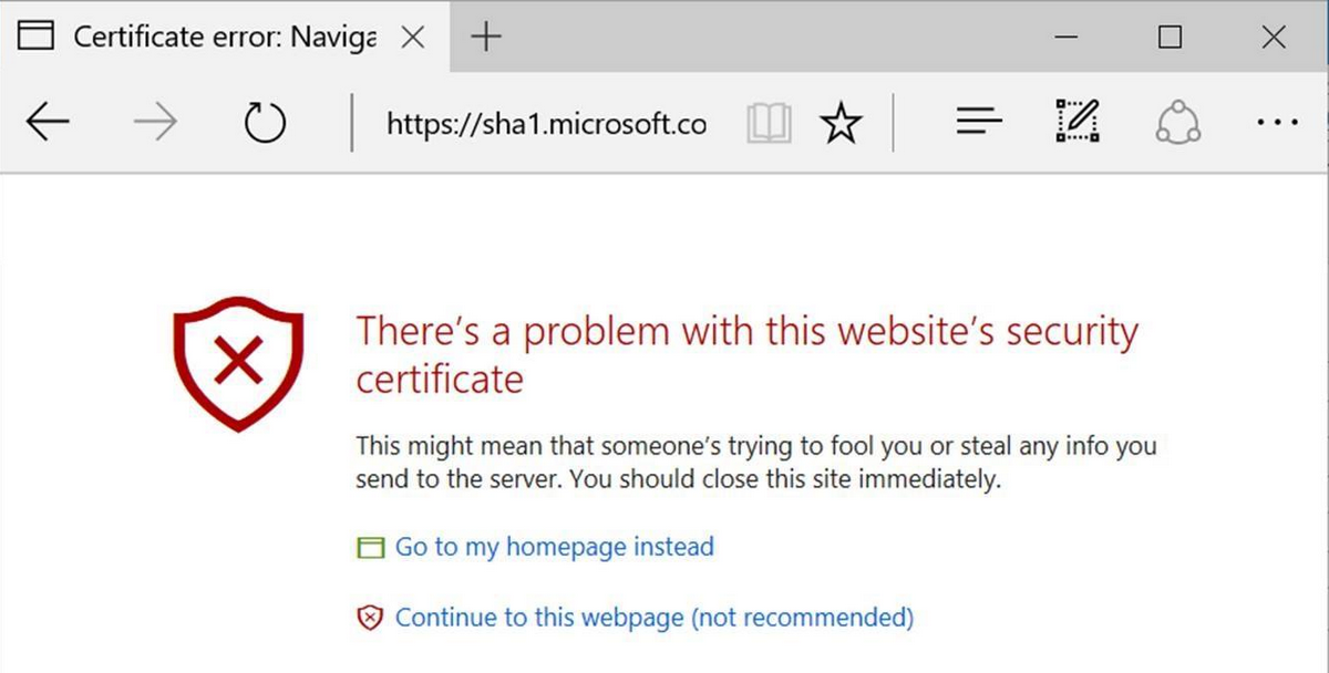 发布日期:2016-11-25Microsoft确认,2017年2月14日是其Microsoft Edge和Internet Explorer 11浏览器停止支持SHA-1的截止日期。在该日期之后,浏览器不会加载仍在运行SHA-1证书的网站,并向用户显示证书无效的警告。用户还必须采取额外的步骤来访问网站,如果他们这样选择。