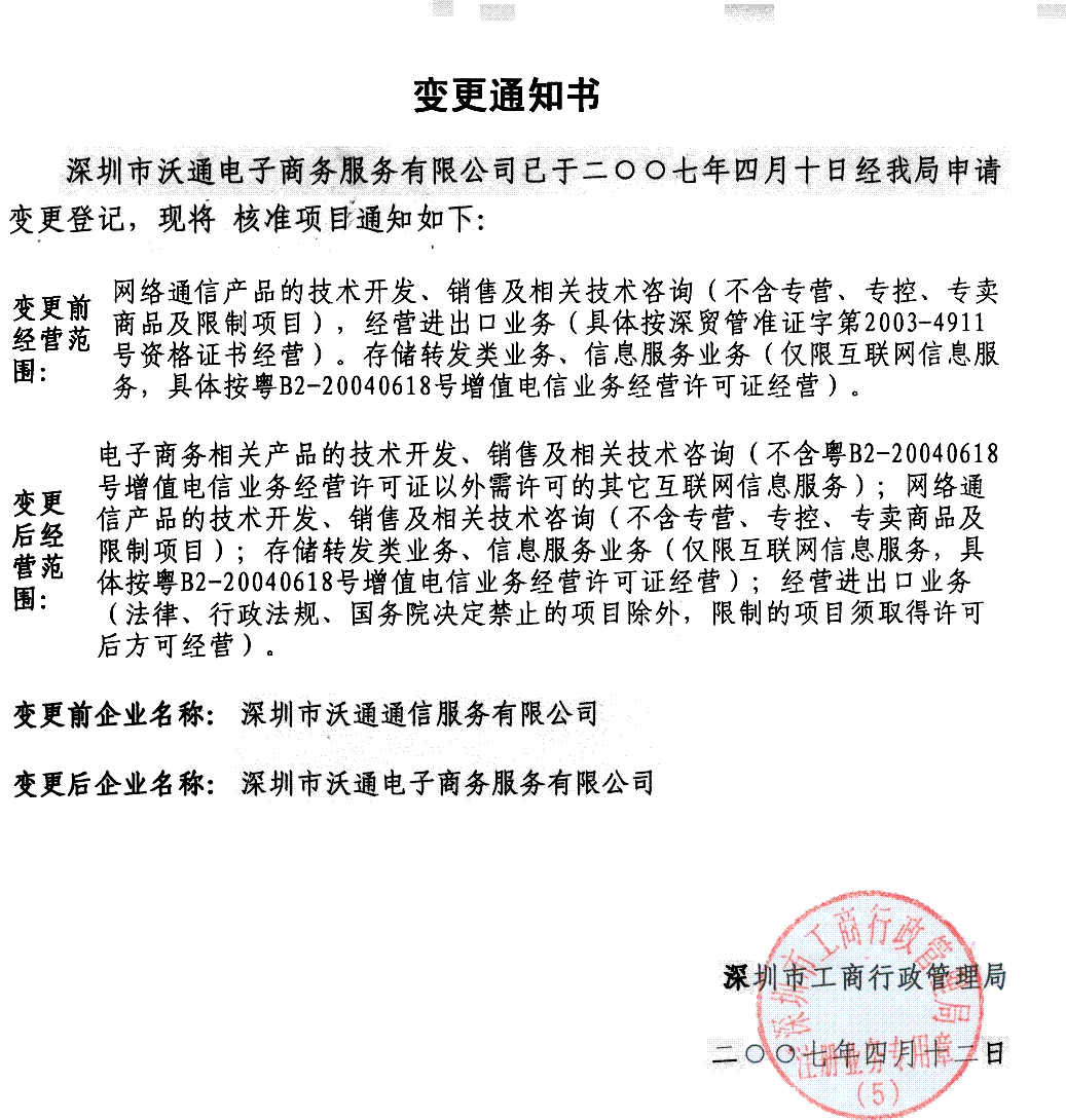 发布日期:2007-04-03鉴于公司业务发展需要,从即日起, 美国公司: Wotone Communications, Inc. 正式更名为: WoSign, Inc. ,而 中国公司:深圳市沃通通信服务有限公司 (Wotone Communications Ltd.) 正式更名为:深圳市沃通电子商务服务有限公司 (WoSign eCommerce Services Limited ) 。敬请广大用户注意,点击 这里 查看工商变更通知书。