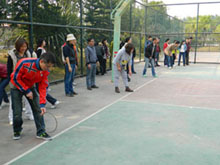 首先我们进行了第一项娱乐比赛项目----滚铁环接力。比赛规则是各队以篮球场的端线为起点,每人滚铁环至另一端线再返回,第二个人再继续,直至最后一人,最先完成的小组获胜。最终获得这个项目的第一名是客服部。