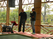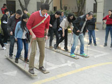 下午3:00左右,我们进行最后一项娱乐竞赛项目---大脚板比赛。该项目主要考察团队协作能力。比赛最大看点是:Richard 领着第四组的另两名女兵经历了木板上的绳子脱离,换比赛器具后仍坚持到了终点。最终第一组凭借他们的年轻和活力,摘得了这个项目的桂冠。