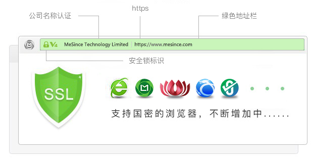 | 主要特点 | 国密浏览器地址栏变成绿色,显示V4和安全锁 | |