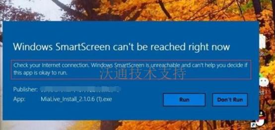 检查你的网络连接。Windows智能屏幕无法访问,无法帮助您决定该应用程序是否可以运行。