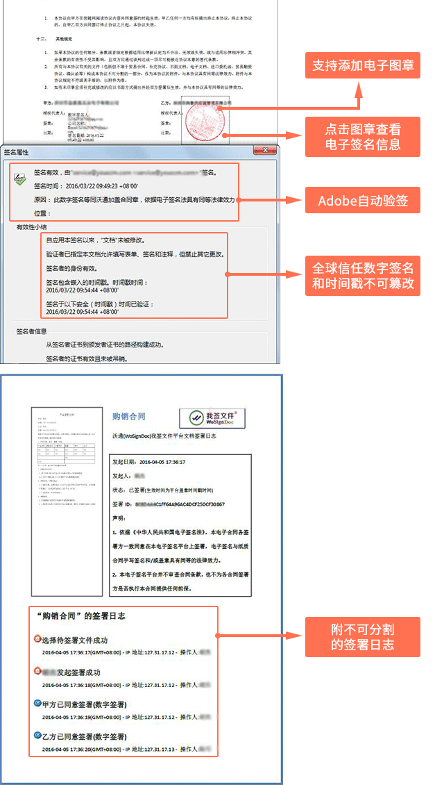 提供可靠电子签名和全球信任时间戳,保证已签署文件的内容和签署时间不可篡改,签署行为不可否认!每份电子合同的最后一页附有不可分割的国际标准电子合同签署过程日志,当交易出现纠纷时,可直接提交给法院用作电子证据。