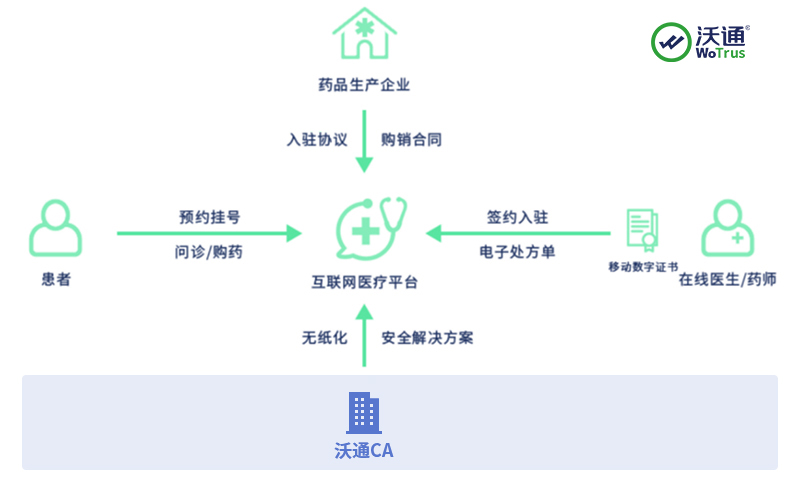 沃通通过相关安全类产品如数字证书、签名验签服务器、电子签章服务器、时间戳服务器等产品,从而实现身份认证、数字签名、加密、解密等功能,保障在互联网医院流程的安全和可靠性。