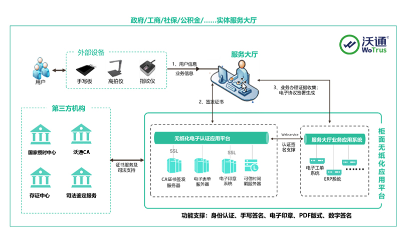 针对上述需求关键点,沃通具备丰富项目实践,通过合法第三方CA证书、可信电子身份认证、电子签名、电子签章等安全技术手段,保障电子政务无纸化业务的各种业务单据的法律效力。