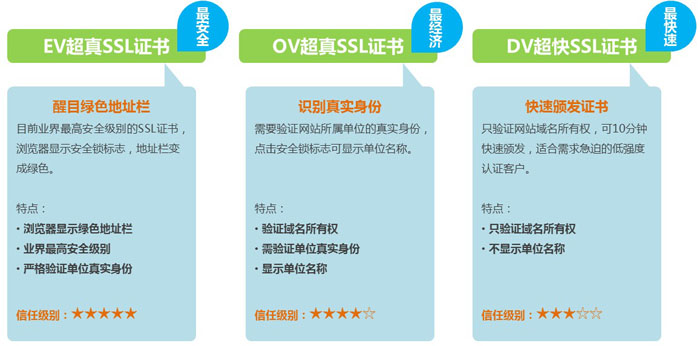 (1) EV超安SSL证书:金融证券、银行、第三方支付、网上商城等,重点强调网站安全、企业可信形象的网站,涉及交易支付、客户隐私信息和账号密码的传输,一定要安装最高安全级别的EV SSL证书。