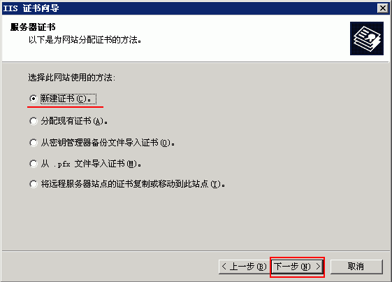 缺省为“新建证书”,点击“下一步”即可,如下图2所示。如果您的服务器中已经有了证书,则选择“分配现有证书”;如果您已经已经备份过证书,则选择“从.pfx文件导入证书”。