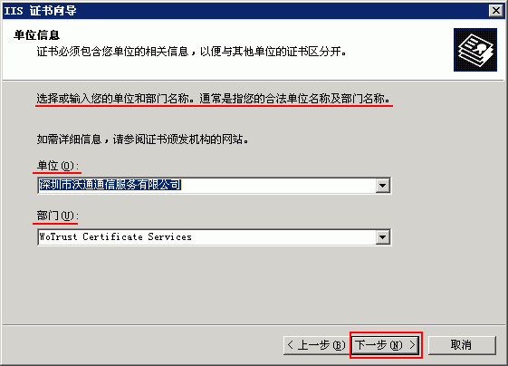 您必须输入您单位的合法单位名称,也就是营业执照或组织机构代码证上的名称,WoSign SSL证书全面支持中文,所以,您可以输入中文名称,也可以输入单位英文名称,但英文名称一定要有英文名称证明文件,或是中文名称的直接翻译。部门名称也可以输入,也可以不输入。如果单位名称填写的是中文名称,建议部门名称就填写单位英文名称,以便英文用户查看SSL证书信息时也能看到单位英文名称。