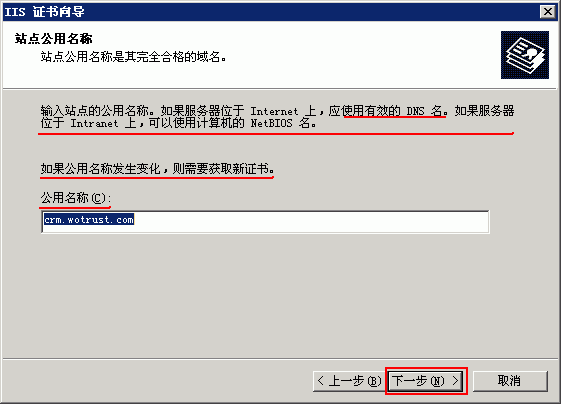 公用名称(Common Name)是SSL证书中最重要的字段(简称:CN),是绑定申请单位的服务器名称的,如果您的服务器是位于互联网上,则一定要输入该服务器的域名,如:www.domain.com,或 oa.domain.com,而不能只输入domain.com;如果您的服务器是在内部网上使用,则可以填写主机名(NetBIOS名)。请注意:WoSign SSL证书支持中文域名,如果您是为中文域名申请证书,则此处就填写该中文域名的Punycode码域名,如:中文域名为:我信任.com,则应该填写:xn--boqsvp05b.com 。