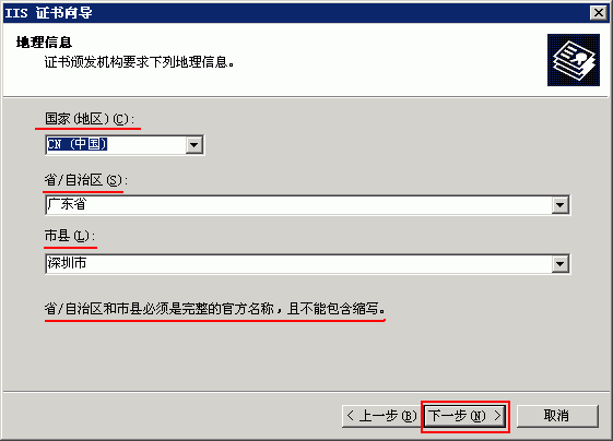 选择国家,缺省为CN,不用动,输入申请单位所在省或自治区全名和所在市县全名,一定要是国家规定的标准名称,而且不能是缩写。您可以输入省市中文名称,也可以输入省市英文名称。