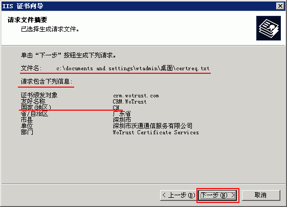 显示CSR中的详细信息,请检查是否正确,此信息将是SSL证书中主题中显示的信息。同时请注意:国家字段只能是国家名称缩写,中国就是CN,而不能是中文:中国。其他所有字段都可以是中文。如果您认为有什么不妥,请点击“上一步”重填。