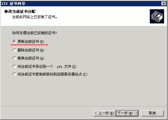 如果您是续费用户,如下图3所示,直接选择缺省的“更新当前证书”即可完成新的CSR文件,如果您的证书还没有到期,则不会影响正常使用。如果您想修改证书中的公司名称等信息,则您需要先“删除当前证书”再生成新的CSR,让服务器挂起,但您的原先证书就不能用了。建议您使用其他服务器生成CSR文件,收到证书并安装成功后导出证书为PFX格式文件,再导入到您的服务器上,选择“替换当前证书”即可。
