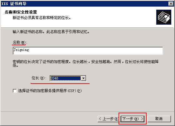 输入新证书的名称,一个您认为好记的名称,可以是中文或英文。选择密钥长度,缺省的1024位,推荐选2048位,确保有足够的加密强度。点击“下一步”即可,如下图4所示。不要选中“选择证书的加密服务提供程序CSP”,除非您的服务器安装了硬件SSL加速卡或其他加密设备。