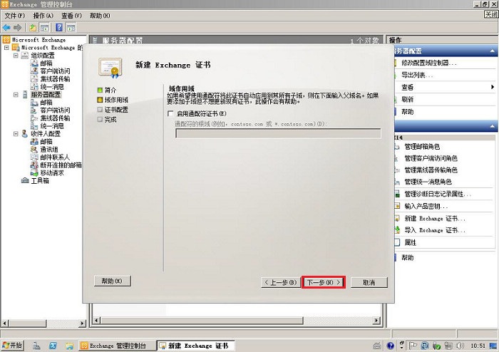 在右边的操作窗中,单击“新建Exchange证书”可打开新建 Exchange 证书向导。此向导将帮助您确定Exchange组织所需的证书类型。在“简介”页面中,为您的证书输入一个友好名称: