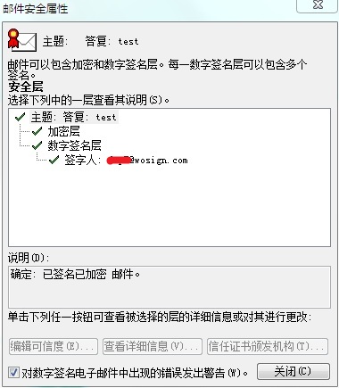 b) 单击“加密”标识后,将显示“邮件安全属性”对话框,以指明该加密邮件是有效的。如图所示。