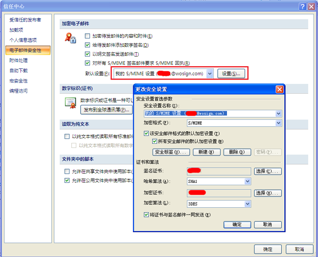 c) 在加密电子邮件下面,点“设置”,出现“更改安全设置”对话框。单击“确定”接受默认值。如图下所示。
