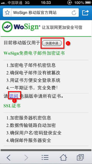 2、说明:在图1-1中,可点“快捷申请”按钮(1 )进行申请证书的操作,也可点“访问”链接(2 )访问电脑版申请更多类型的证书。此处我们只进行手机申请证书的说明,所以我们点“快捷申请”按钮;