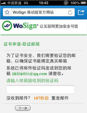 2、根据提示填写证书的绑定邮箱以及您的手机号码,然后点“下一步”按钮。完成申请证书的信息填写。