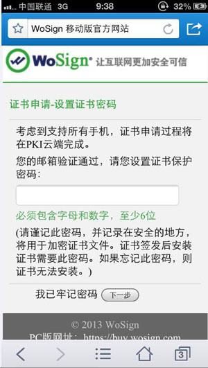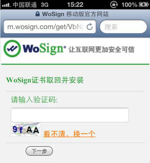 1、打开手机浏览器,输入申请证书的网址:https://m.wosign.com,进入网站,如图1-1所示: