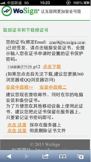 1、证书签发后,您将收到通知您取证书的邮件(主题为Your WoSign Client Certificate is ready for collection!)和短信,点击短信内容中的链接,该链接会打开如下页面,如图5-1: