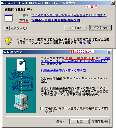 (7) 现在,需要使用 chktrust.exe 来查验已经签名的代码, chktrust.exe 文件已经打包在 signcode.rar 中。进入 DOS 命令提示符,并进入已经签名的文件所在目录 ( 如: d:\sign\TestSign.cab) ,键入命令: chktrust testsign.cab ,则会显示实际应用时在 IE 浏览器下载页面的情况,如下图 11 所示,对于Win XP操作系统,会显示软件名称和发行者名称,其中软件名称就是您在第(8)步输入的描述,点击此名称就链接到您在第(8)步填写的网址,而点击发行者名称,则会显示您的签名信息和时间戳信息。对于Win2000 操作系统,则稍有不同,第 1 行的红线部分就是时间戳记录的签名时的本地时间,请注意:此时间不是取签名电脑的时间,而是 WoSign提供时间戳服务的服务器计算出来的签名电脑设置的所在时区的本地时间。第 1 行蓝色文字就是在第 8 步中输入的描述文字,点击此蓝色文字就可以访问在第 8 步中输入的 Web 描述页面。第 2 行蓝色文字则为该代码的发行者,也就是代码签名证书的申请者 ( 拥有者 )( 如:沃通电子认证服务有限公司) ,点击可以查看证书的详细信息;第 2 行有红色下划线部分显示“发行商可靠性由 WoSign Code Signing Authority 验证 ”就是此代码签名证书的证书颁发者。