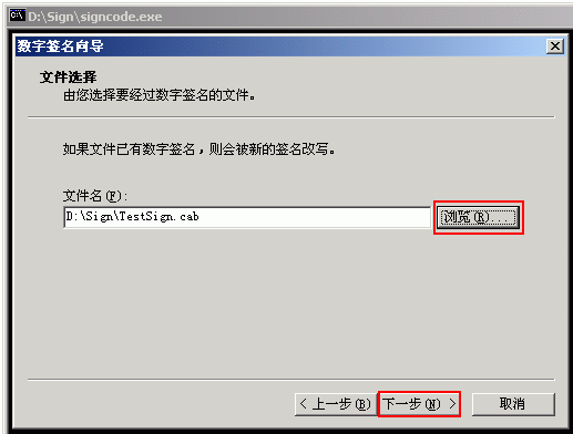 (1) 运行 Signcode.exe ,要求您选择需要签名的文件,支持:可执行文件 (*.exe; *.dll; *.ocx) ; Cabinet 打包文件 (*.cab) 和目录文件 (*.cat) ,如下图 1 所示 ( 如: TestSign.cab) ,请注意:如果签名的文件已经有数字签名,则会被新的签名覆盖: