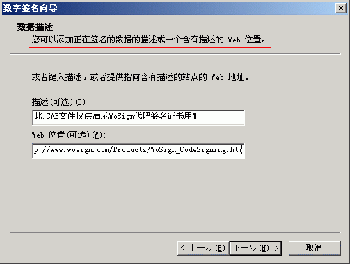 (4) 如下图 4 所示,要求填写该签名代码的功能描述,推荐一定要认真填写,因为此信息将会在最终用户下载此代码时显示,有助于最终用户了解此代码的功能以确定是否下载安装。第一行“描述”是指此代码的功能文字描述,第二行“ Web 位置”则让最终用户点击文字描述来详细了解此代码的功能和使用方法等,本演示中的“ Web 位置”为WoSign代码签名证书简介页面: