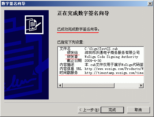 (6) 点击“下一步”后,如下图 6 所示,会提示已经完成数字签名向导,点击“完成”就完成了中文版代码签名证书的代码签名。