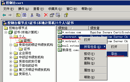 8. 再点击“个人”的“证书”,就会出现您的服务器上安装的SSL证书,选中您的服务器证书后,右键就出现“所有任务”的“导出”菜单,点击“导出”就可以备份您的服务器SSL证书了 (图 10):