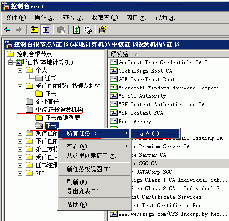 16. 如果您在导出备份时没有选中“包含证书路径中所有证书”,则表明您没有备份整个证书链,在导入安装时可能会有问题。补救的办法就是手动导入中级根证书:如果您购买的是 超真SSL,则需要 下载(或下载) 其中级根证书;如果您购买的是 SGC超真SSL,则需要 下载(或下载)其中级根证书;如果您购买的是 超快SSL,则需要 下载(或下载)其中级根证书;并按照如下图示在“中级证书颁发机构”-“证书”右击后的“所有任务”中的“导入”即可安装成功 (图 18):