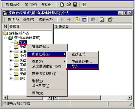 14. 证书备份出来后,一旦需要重新导入,则还是在控制台中操作,在“证书” - “个人”菜单右击鼠标就可以看到“所有任务” - “导入”按步骤就可以导入您的服务器 SSL证书即可 (图 16):