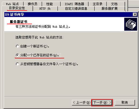 15. 导入证书后,您还要到“ Internet 服务管理器”中为您的网站分配一个系统中已经存在的证书,点击“目录安全性” - “服务器证书”即可,请注意:只能在原申请证书的域名(网站)上使用SSL证书(图 17):