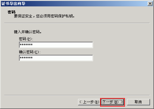 11. 请按照下图指示,在密码框内输入您的服务器数字证书私钥密码,一定要有足够长度 ( 建议 6 位以上 ) ,以后导入安装时需要此密码,一定不能忘了此密码,否则如果服务器重装时需要导入您的SSL证书就没有办法了。点击“下一步”按钮 (图 13):