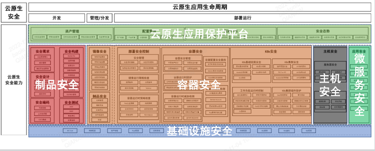 不难看出,整个框架以应用为中心,安全能力覆盖整个云原生架构以及云原生应用的全生命周期。其中纵向从下到上覆盖云原生应用运行的基础设施,包括IaaS平台、PaaS平台、主机及容器工作负载以及应用自身对应的微服务,横向从左到右覆盖云原生应用的整个生命周期,包括开发、部署和运行时。