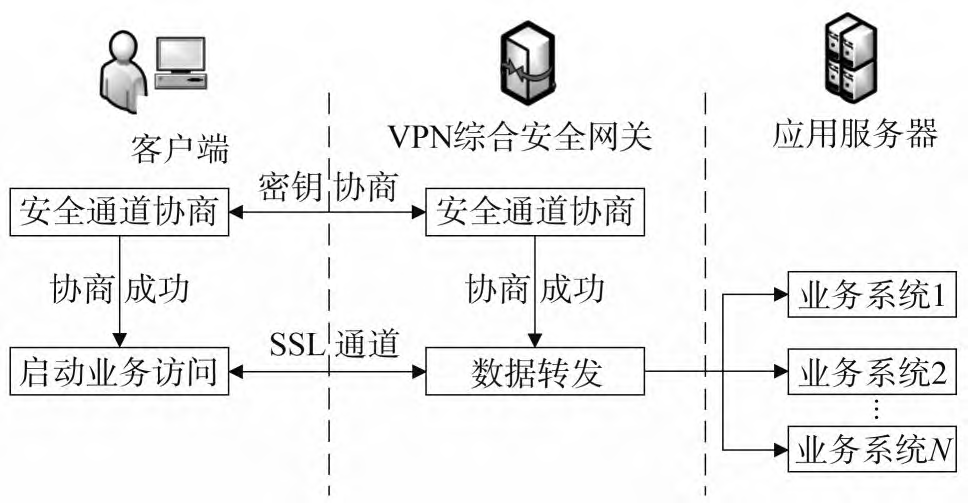 客户端输入认证客户端账号和密码,插入 USB⁃KEY通过数字证书认证,登录VPN综合安全网关;客户端和 VPN 综合安全网关协商 VPN 安全通道;提交应用业务登录请求。系统客户端和VPN综合安全网关通过SSL 安全通道进行数据传输,保障互联网数据传输的安全性。VPN综合安全网关和应用服务器间通过普通通道进行数据传输。