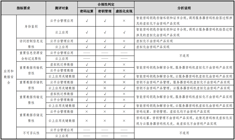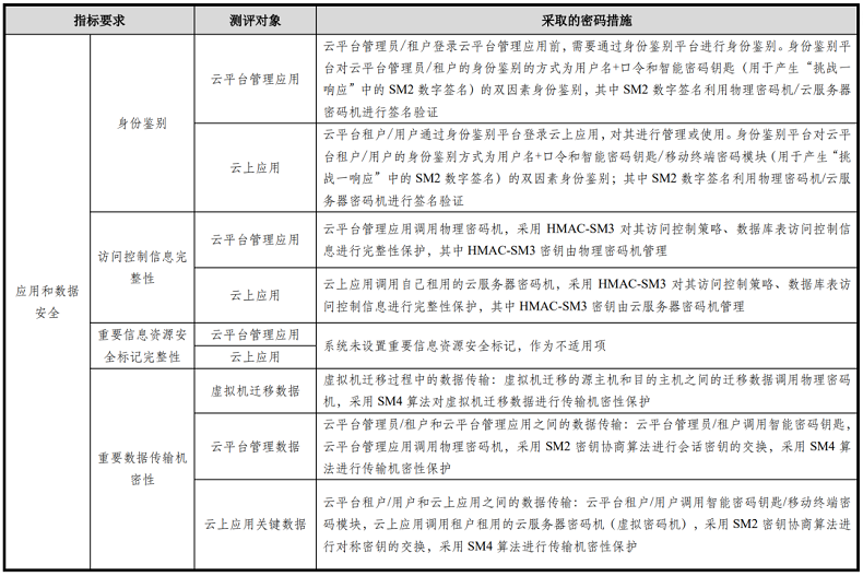 表2所示为该云平台在应用和数据层面每个测评指标对应的密码改造措施,其中使用的密码产品、密码服务,均符合国家密码管理部门要求。