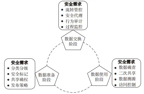 数据中心主要通过数据资源共享机制为各用户提供数据资源服务,数据资源在共享利用的各阶段,数据安全防护的需求各有不同。数据共享过程可以分为数据准备、数据交换和数据使用 3 个阶段。依据数据资源特征,其各阶段安全需求如图 1 所示。