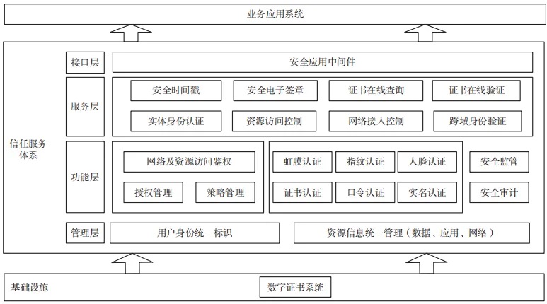 信任服务体系可为应用系统提供安全高效的中间平台。数字证书系统为信任服务体系提供基础安全功能,包括电子认证服务和签发数字证书,支撑信任服务体系构建包含管理层、功能层、服务层和接口层等安全功能体系。管理层实现用户身份和应用资源统一管理;功能层基于管理层相关信息资源实现授权、认证、审计和监管等功能;服务层面向云、数据中心和业务应用系统提供各类安全支撑服务,包括实体身份认证、实体权限鉴别、跨域可信身份验证、时间戳、电子签章等;接口层通过统一的安全应用中间件对外提供调用接口,便于安全功能集成和应用。