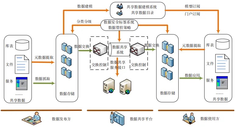 数据共享安全体系基于数据提供方管控、数据共享平台、数据使用方管控 3 个维度,利用数据加密、数字签名、信任服务等安全基础技术和数据管控机制,实现数据抓取和存储、传输和交换、获取和使用等过程的安全控制,其核心内容包括数据共享建模、数据安全标签、数据共享平台等部分。
