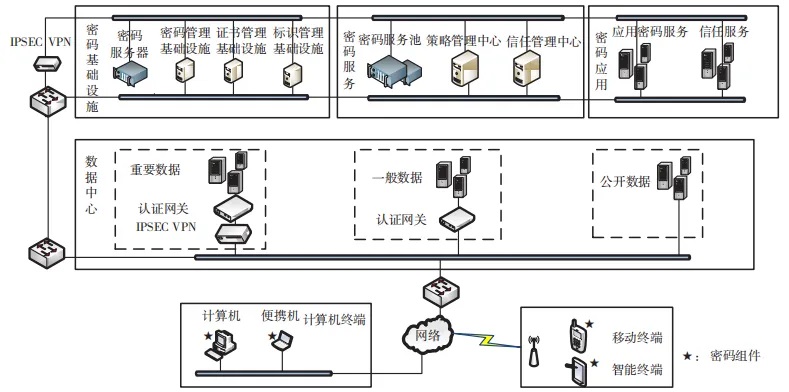 (1)密码基础设施。密码基础设施利用密码服务器提供密码运算,通过密码服务池、密码管理基础设施、证书管理基础系统、标识管理基础设施等为数据中心提供密码管理、密钥管理、证书管理、数据标识管理等基础服务。