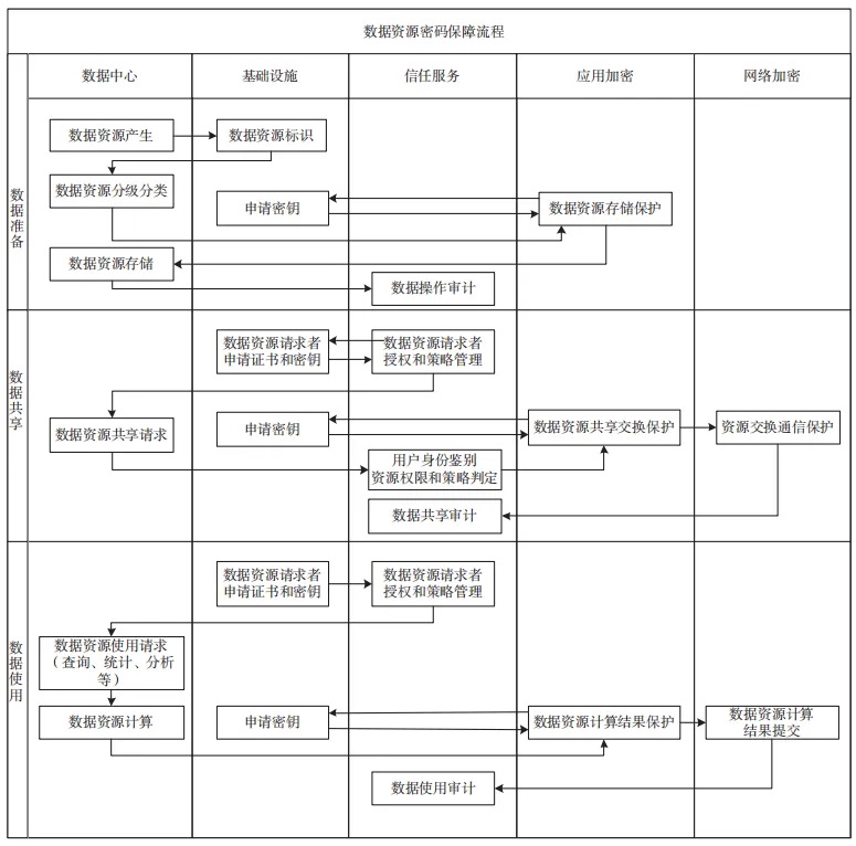 数据中心在实现数据准备、数据共享和数据使用的过程中,其与密码保障功能各部分之间的基本流程如图 7 所示。