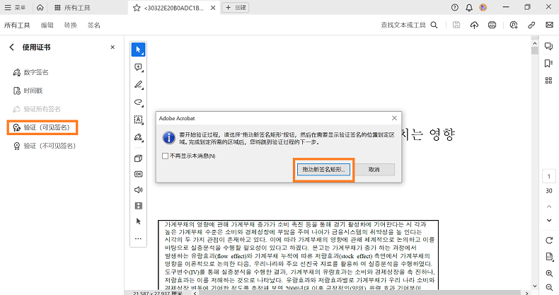选择验证(可见签名)以使用可见数字签名进行验证,然后在出现的对话框中选择拖动新签名矩形。
