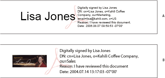 在“首选项”对话框的“签名”面板中选择相应选项,可以确定基于证书的签名外观。例如,可以包括您的手写签名图像、公司徽标或照片。您还可以创建不同的签名,以用于不同目的。对于某些情况,您可以提供更高级别的详细信息。签名也可以包括帮助他人验证您的 签名 的信息,例如签名原因、联系信息等。