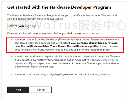 驱动程序开发者必须通过 “Windows 硬件开发人员中心仪表板门户”向微软提交新驱动程序,门户帐户注册过程,必须使用 EV 代码签名证书签名指定文件,才能完成帐户注册。因此注册账户前,软件开发者应提前向专业证书服务机构(如:沃通CA),申请一张EV代码签名证书备用。