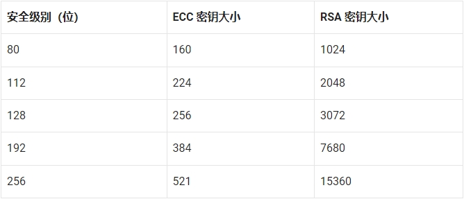 密钥长度更小:ECC 提供与 RSA 同等的安全性,但密钥长度却小得多。例如,256 位 ECC 密钥提供与 3072 位 RSA 密钥相当的安全性。