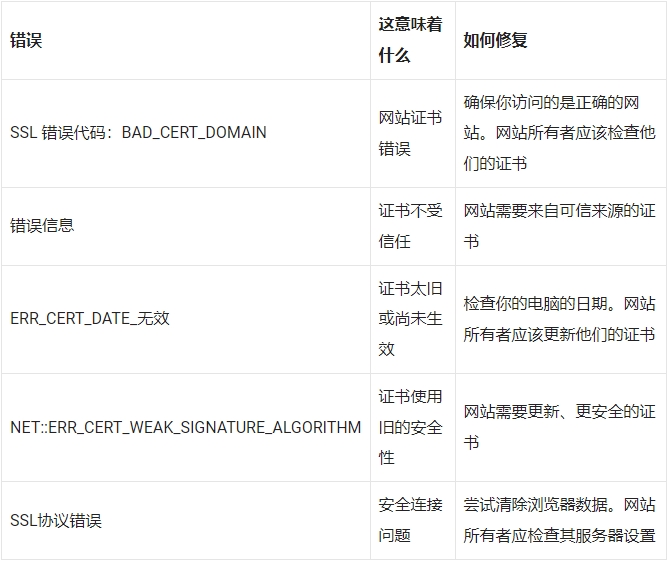 以下是一个简单的表格,可帮助您快速修复常见的 HTTPS 错误: