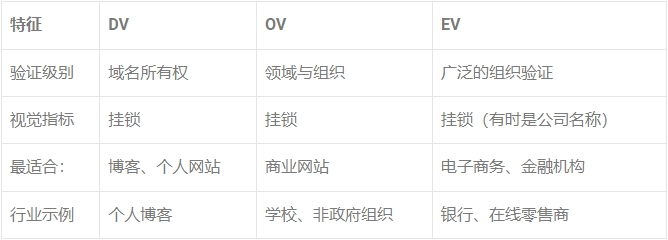 SSL/TLS 证书主要有三种类型,每种类型都提供不同级别的验证并适合特定的行业需求。