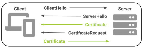 相互认证(即 SSL/TLS 会话中的服务器和客户端都经过认证)也是可行的,在某些情况下非常有用。在相互认证中,一旦服务器在握手过程中通过了认证,它就会 CertificateRequest 向客户端发送一条消息。客户端将通过向服务器发送证书进行认证来做出响应: