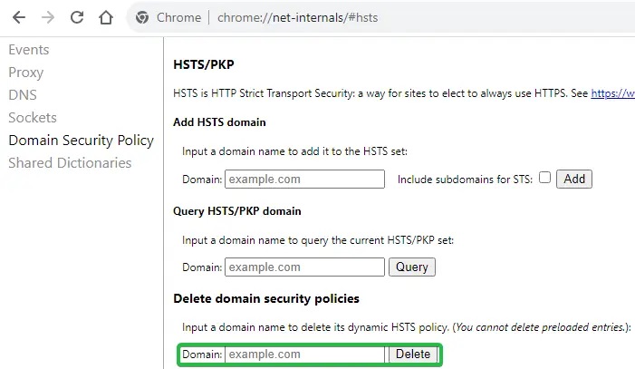 2.在 HSTS 菜单下找到删除域安全策略部分。在域字段中输入您遇到 HSTS 错误的域名,然后单击删除按钮以删除该网站的 HSTS 设置。