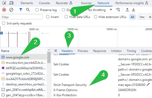 5.在请求的Headers部分,查找Strict-Transport-Security 标头。